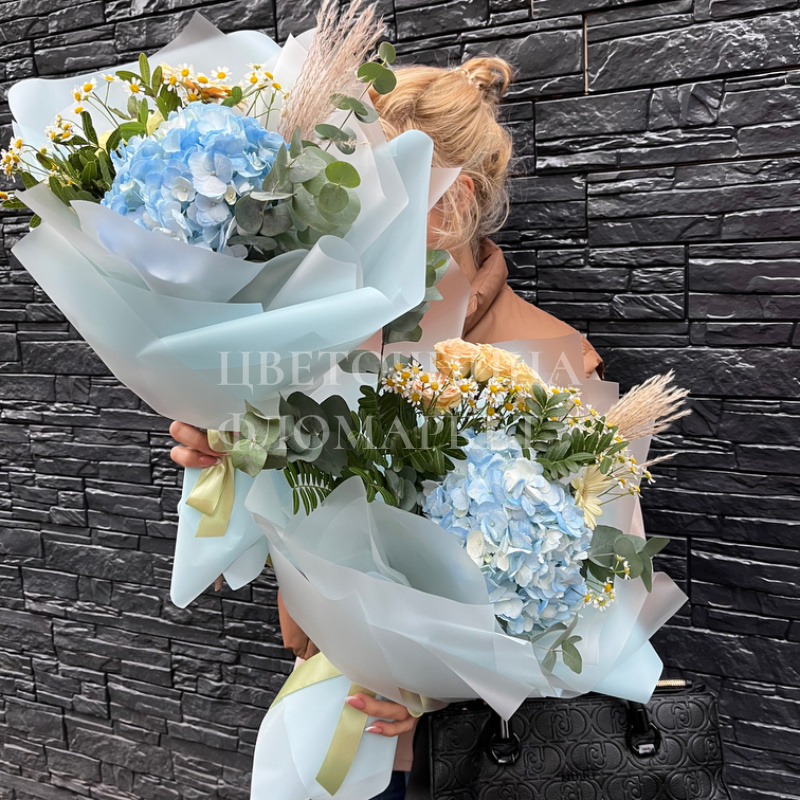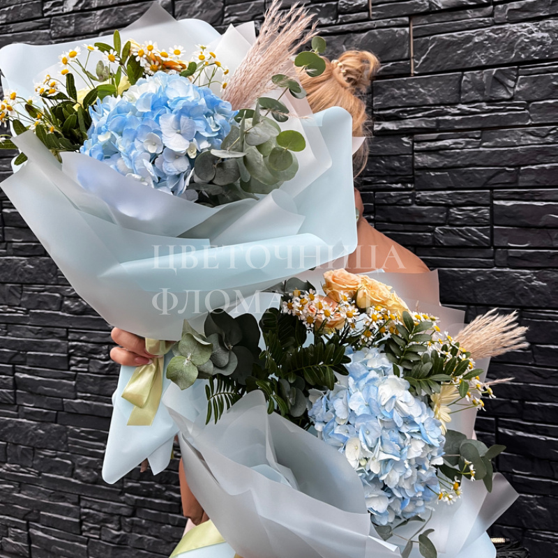 Шикарный букет микс с гортензией, эустомой и пионовидной розой