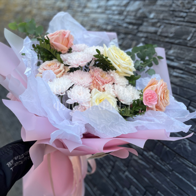 Букет нежность из сортовых роз и хризантем