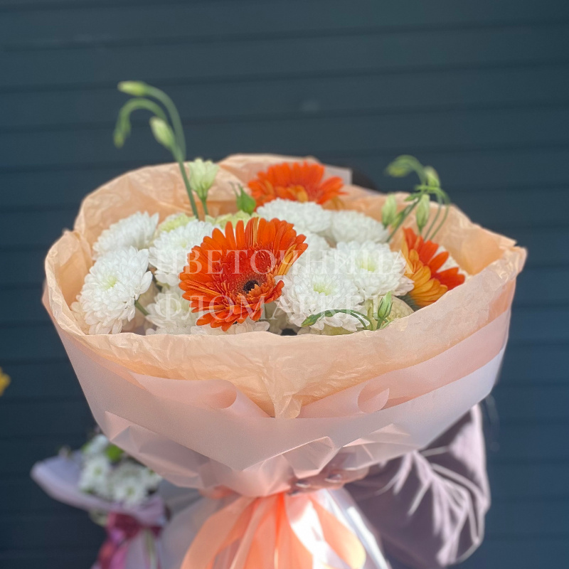 Букет из белых хризантем и оранжевых гербер, элегантно упакованный в мягкую персиковую бумагу и перевязанный нежным бантом, создаёт яркий контраст цветов и текстуры. Это сочетание придает букету свежесть и выразительность, делая его идеальным выбором для разнообразных поводов. Хризантемы символизируют долголетие и счастье, а герберы радость и позитив, что делает букет приятным подарком.