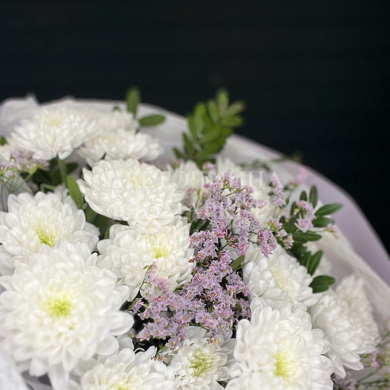 Букет из белых хризантем и фиолетового лимонума перевязанный фиолетовой лентой, олицетворяет нежность и элегантность. Сочетание цветов и текстур создает воздушную композицию, подходящую для любого торжественного случая. Этот букет станет прекрасным выражением чувств и изящным дополнением к интерьеру.