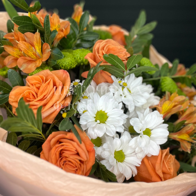 Букет, представленный на изображении, выполнен в нежных тонах и включает в себя сочетание персиковых роз, белых ромашек и зеленых элементов. Необычные цветы и спокойная цветовая палитра придают композиции свежий и элегантный вид. Этот букет станет прекрасным выбором для любого торжества.
