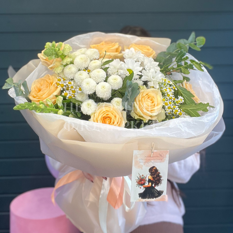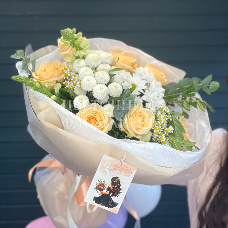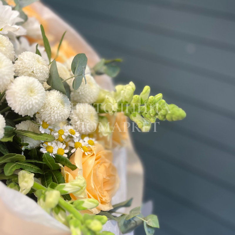 Букет из нежных желтых роз и белых хризантем, дополненный зеленью эвкалипта, станет прекрасным подарком для самых близких. Необычная композиция в светлых тонах вызывает радостные эмоции и передает самые добрые чувства.