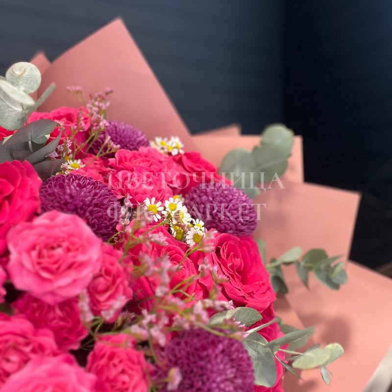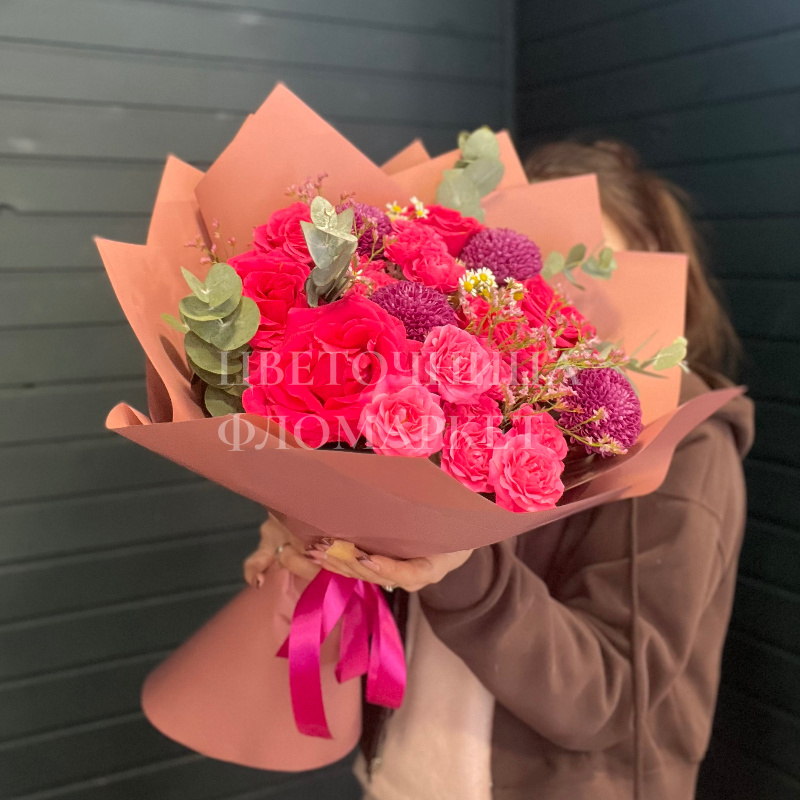 Элегантный букет, состоящий из розовых и фиолетовых оттенков, перевязанный атласной лентой и упакованный в красивую упаковку из матового картона персикового цвета, станет прекрасным подарком для самых дорогих людей. Букет состоит из сочных роз насыщенного розового цвета, нежных кустовых роз, фиолетовых скабиоз и гипсофилы, а также эвкалипта.
