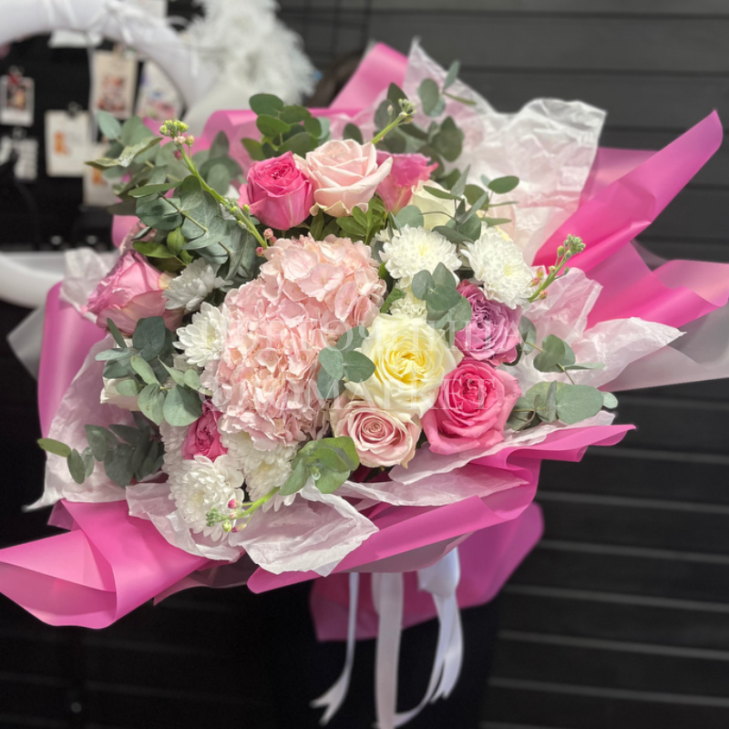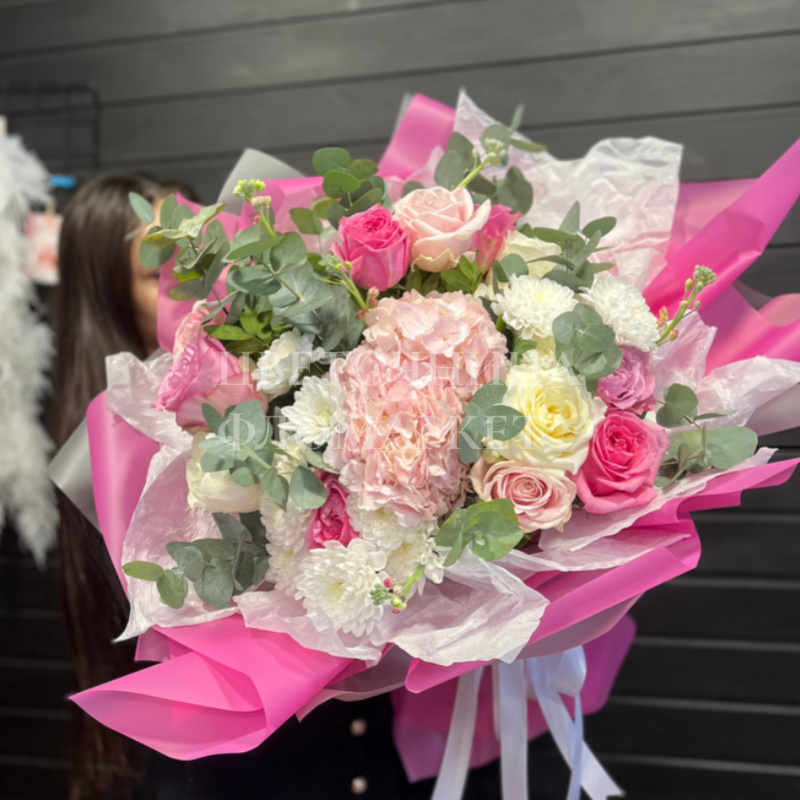 Букет, сочетающий в себе розовые и белые оттенки цветов, включая розы и гортензии, создает нежный и элегантный образ. Необычные белые вкрапления добавляют композиции свежесть и воздушность. Букет отлично подойдёт для подарка или для того, чтобы наполнить пространство лёгкой и романтичной атмосферой.