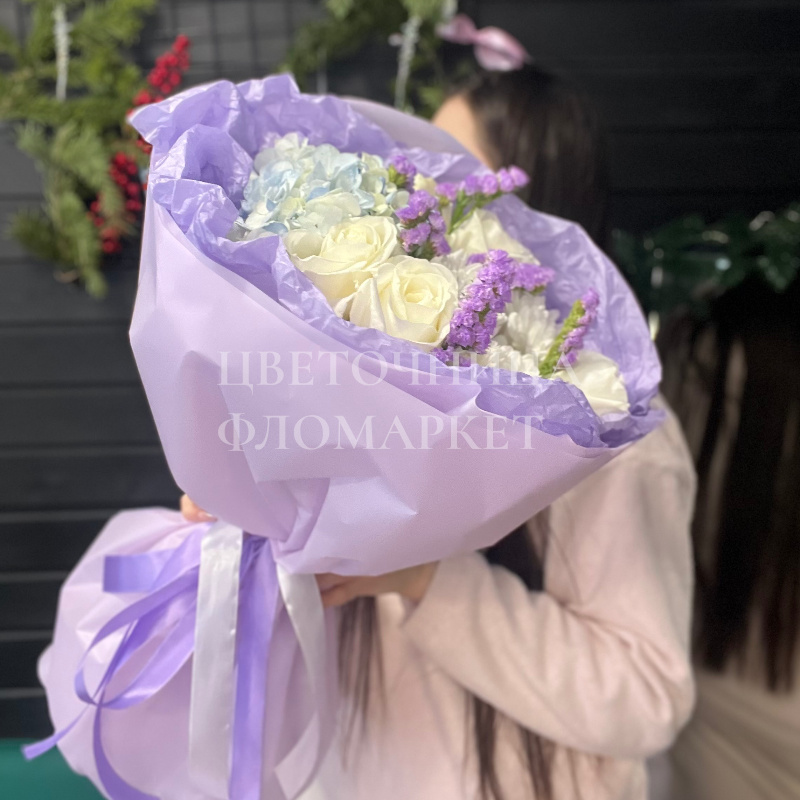 Букет, состоящий из белых роз и фиолетовых гипсофил, элегантно упакован в лавандовую бумагу и дополнен воздушными лентами. Нежные оттенки цветов создают романтичное и трогательное настроение, идеальное для выражения чувств. Этот букет станет прекрасным подарком для любимой или близкой женщины.