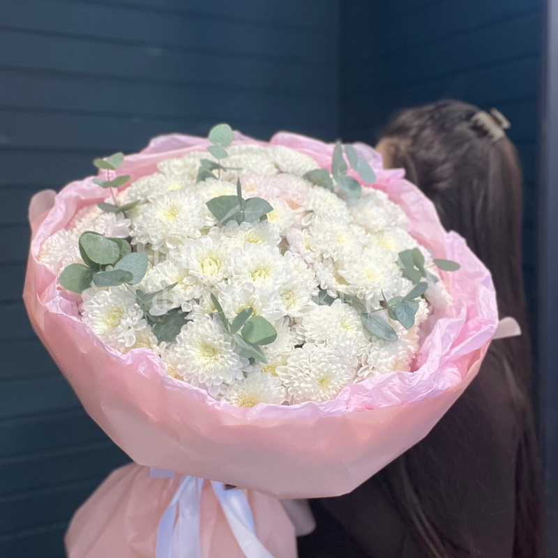 Букет, представленный на фотографии, представляет собой элегантную композицию из белых хризантем, перевязанных лентой и упакованных в розовую бумагу. Хризантемы символизируют долголетие и радость, а их белый цвет ассоциируется с чистотой и невинностью. Дополняющие букет листья эвкалипта добавляют свежесть и изящество, делая композицию еще более выразительной. Этот букет идеально подходит для выражения искренних чувств и является прекрасным выбором для любого торжественного случая.
