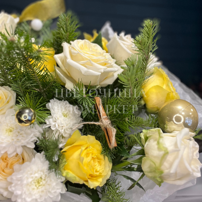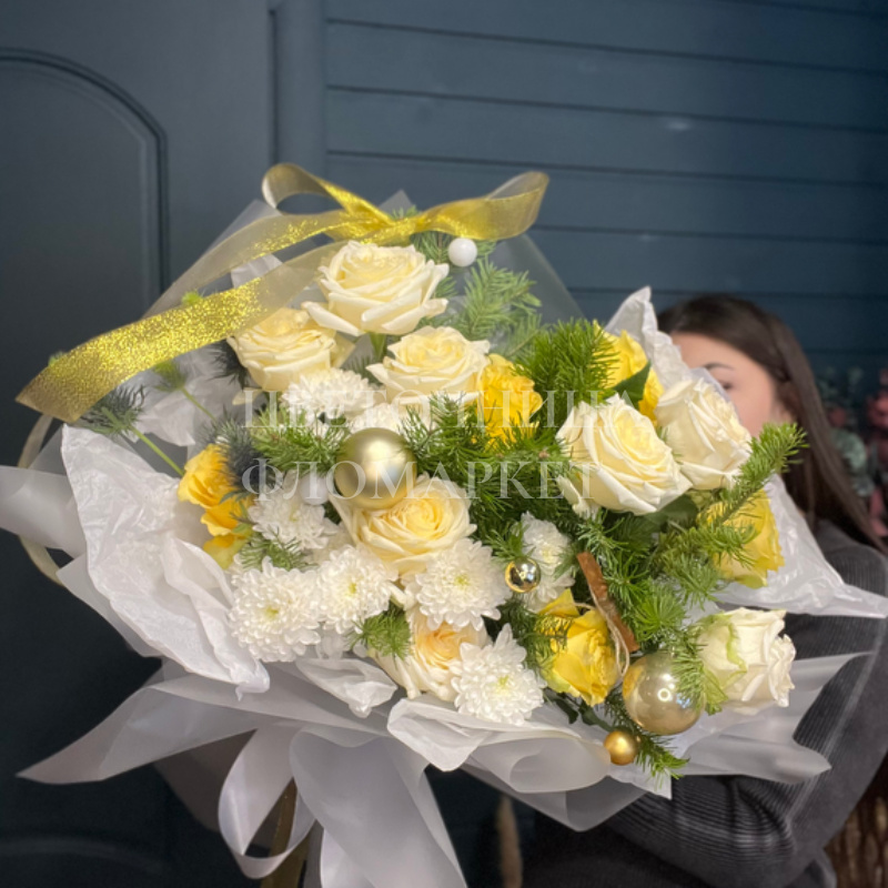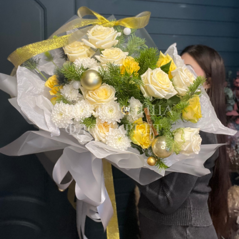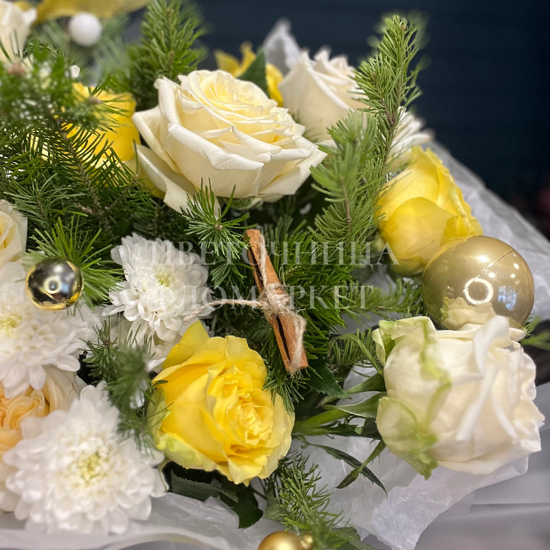 Букет "Зимняя сказка" - это нежное сочетание белых и желтых роз, дополненное воздушными хризантемами и изумрудной зеленью. Золотые украшения придают композиции праздничный и волшебный вид. Этот букет станет прекрасным подарком на Новый год или любое другое торжество, наполняя его теплом и светом.