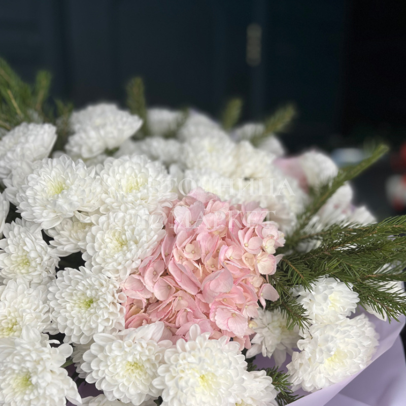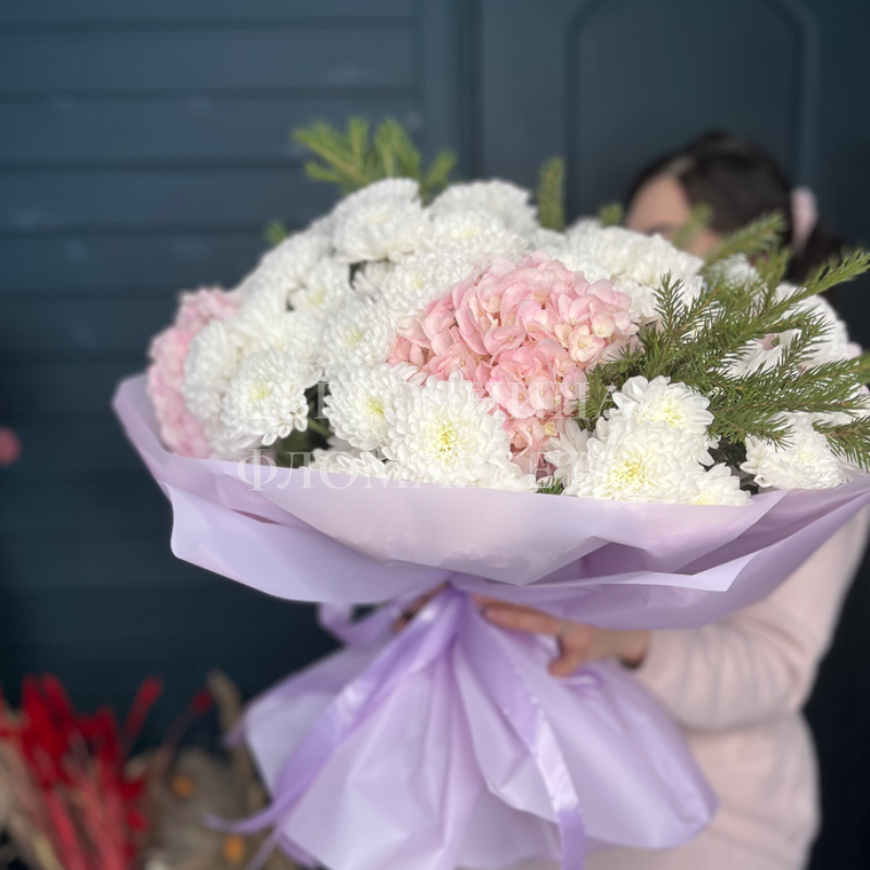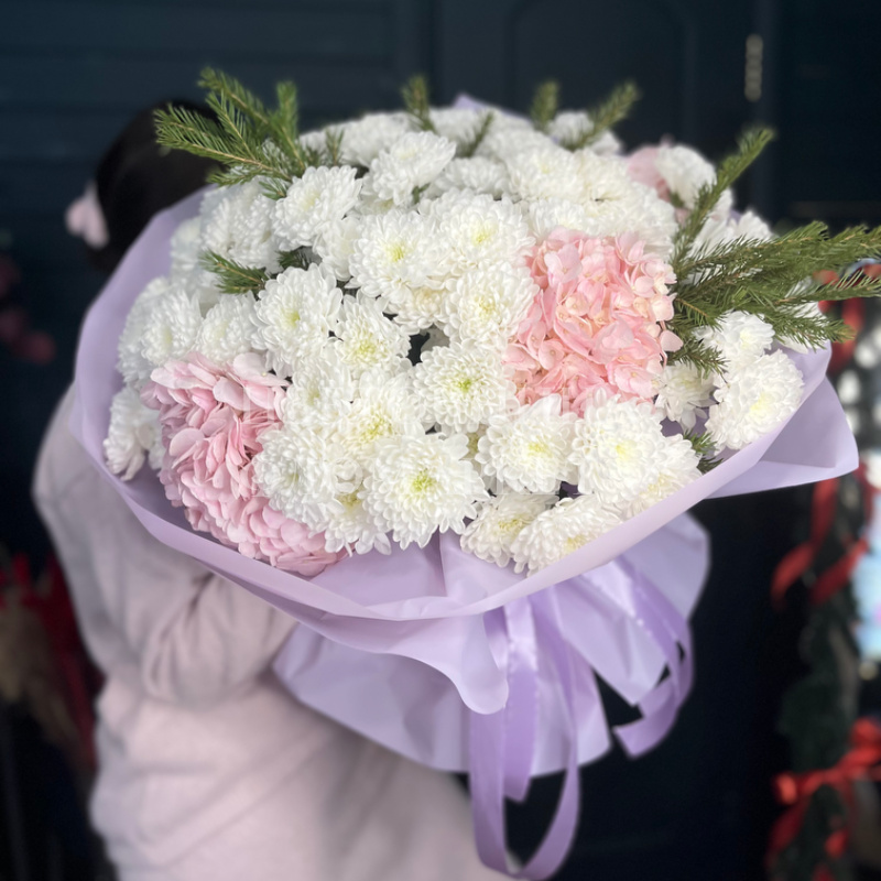 Букет, представленный на изображении, выполнен в нежных тонах и включает в себя белые и светло-розовые цветы, дополненные зеленью. Композиция элегантно оформлена в светло-фиолетовую бумагу с бантом, что придает ей завершенный и праздничный вид. Этот букет идеально подходит для выражения нежных чувств и станет прекрасным подарком.