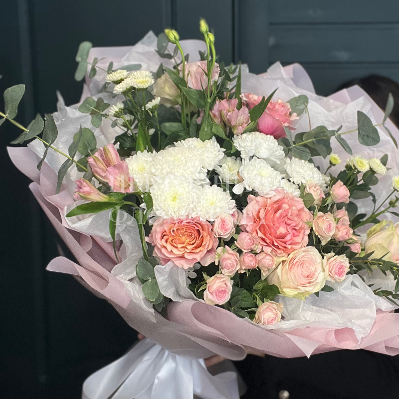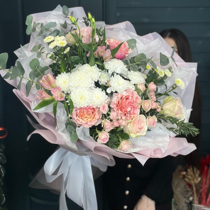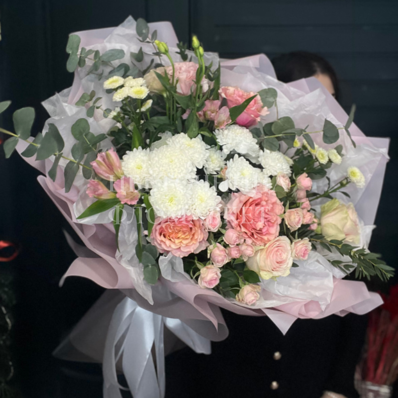 Букет, представленный на фотографии, олицетворяет изящество и нежность. Составленный из розовых роз, белых хризантем и дополненный зеленью эвкалипта, он создает ощущение воздушности и легкости. Этот букет станет прекрасным подарком для любого торжества, наполняя его теплом и светом.