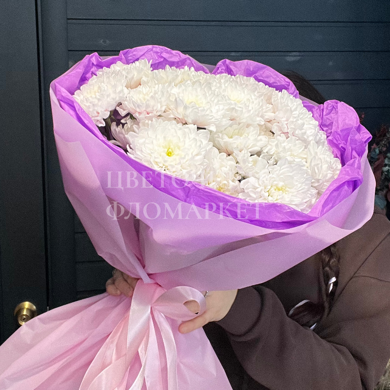 Букет из белых хризантем, элегантно упакованный в фиолетовую оберку с атласной розовой лентой, создает нежный и трогательный образ. Этот букет идеален для выражения искренних чувств и станет прекрасным подарком.