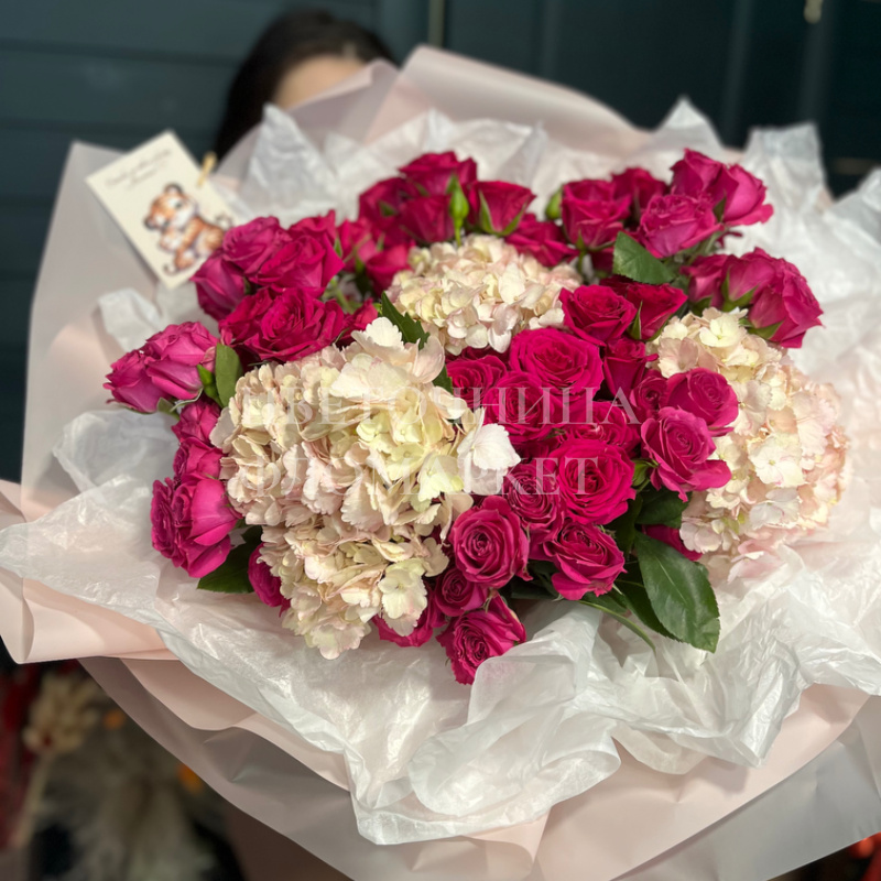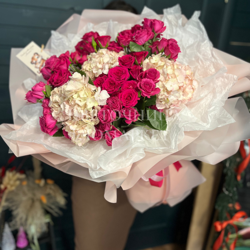 Букет, представленный на фотографии, являет собой великолепное сочетание ярких розовых роз и воздушных белых гортензий. Цветы гармонично дополняют друг друга, создавая насыщенную и в то же время лёгкую композицию. Тщательная упаковка в нежно-розовую бумагу и прозрачную плёнку подчёркивает элегантность букета, делая его идеальным выбором для особого случая.