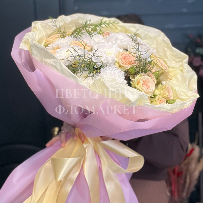Букет, выполненный в нежных тонах, представляет собой элегантную композицию из персиковых роз и белых хризантем, дополненную изящной зеленью. Необычная цветовая гамма упаковки делает букет еще более стильным и запоминающимся. Этот букет станет прекрасным подарком для самых дорогих людей.