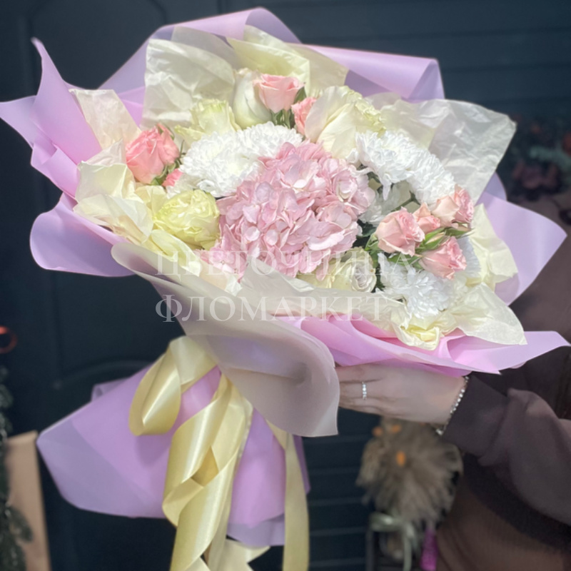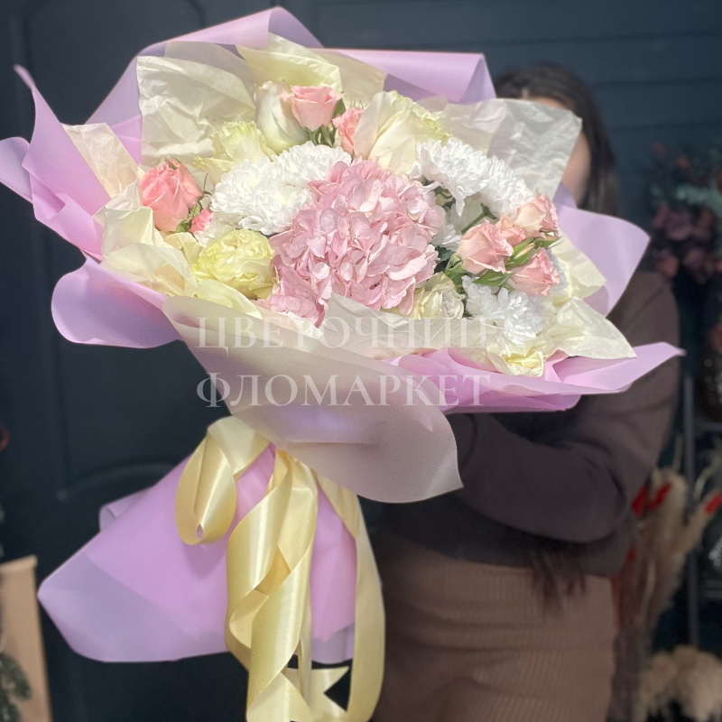 Нежный букет воздушных цветов в пастельных тонах это настоящий шедевр флористического искусства. Букет поражает своей красотой и элегантностью, благодаря чему станет прекрасным подарком для любого торжества.