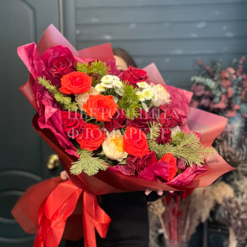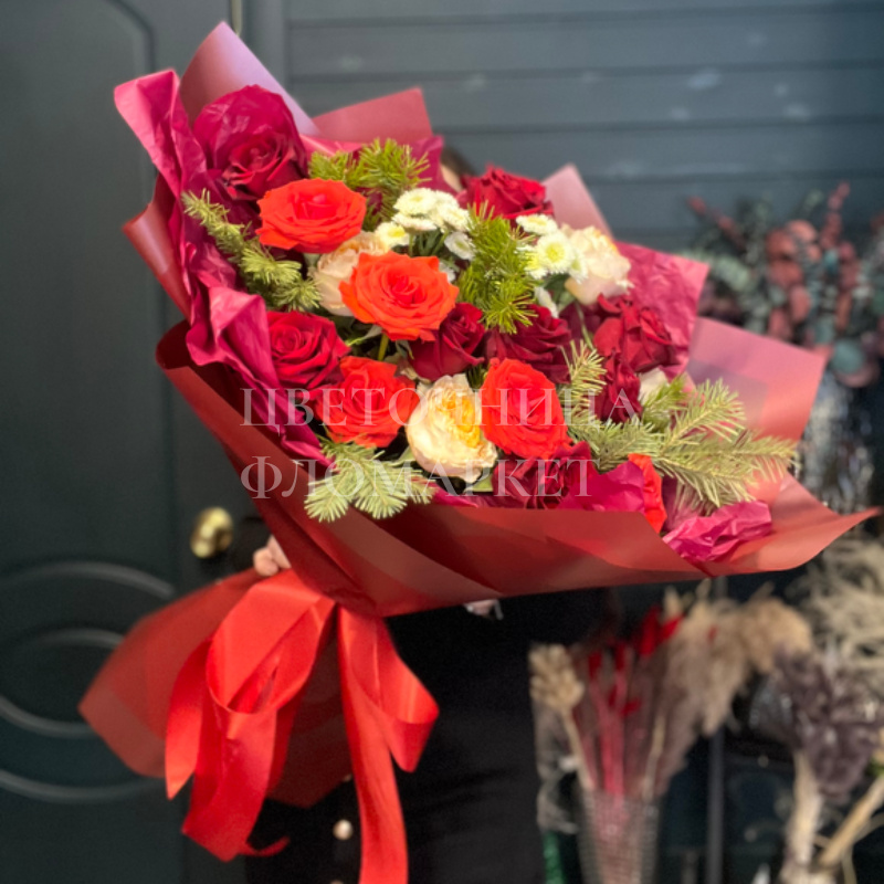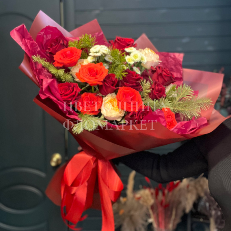 Роскошный букет, в котором изящество красных и коралловых роз гармонично сочетается с нежностью белых гвоздик, станет идеальным подарком для самых дорогих людей. Свежие цветы, искусно собранные в букет и дополненные зеленью, порадуют яркими красками и притягательным ароматом. Яркая упаковка добавляет ему торжественности.