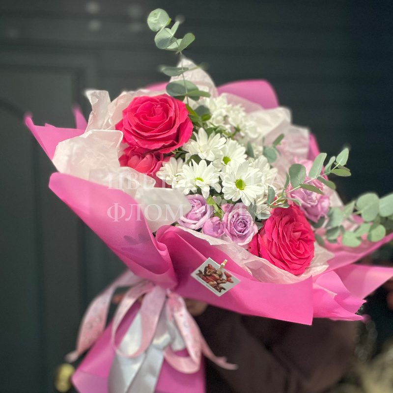Букет, представленный на изображении, - это элегантная композиция из розовых и красных роз, белых маргариток и зеленых веток эвкалипта, элегантно упакованная в розовую бумагу с белой лентой. Вот возможное описание для каталога цветов: "Нежный букет с яркими розовыми и красными розами, белыми ромашками и свежим эвкалиптом, создающий легкую и романтичную атмосферу. Идеальный подарок для того, чтобы выразить свою любовь и нежность."