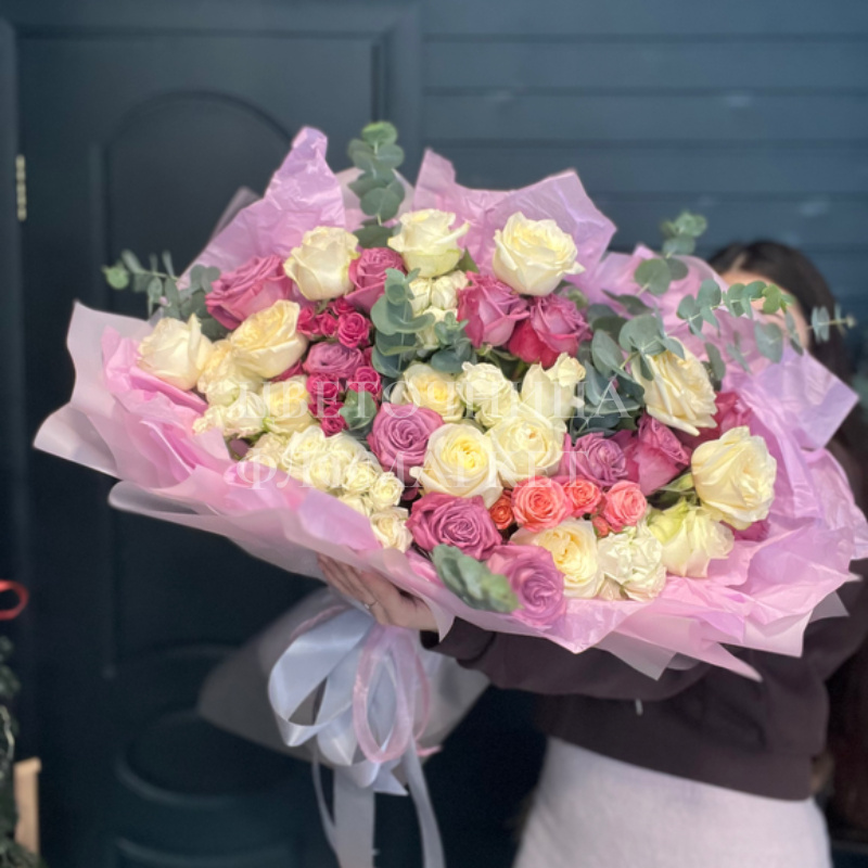 Букет с нежными розами белого, розового и персикового оттенков. Небольшие бутоны красиво дополнены изумрудной зеленью эвкалипта, создавая эффект лёгкого, летящего букета. Такой подарок обязательно порадует и удивит свою обладательницу.
