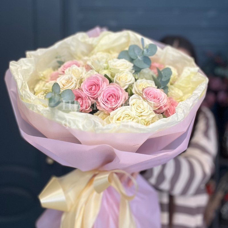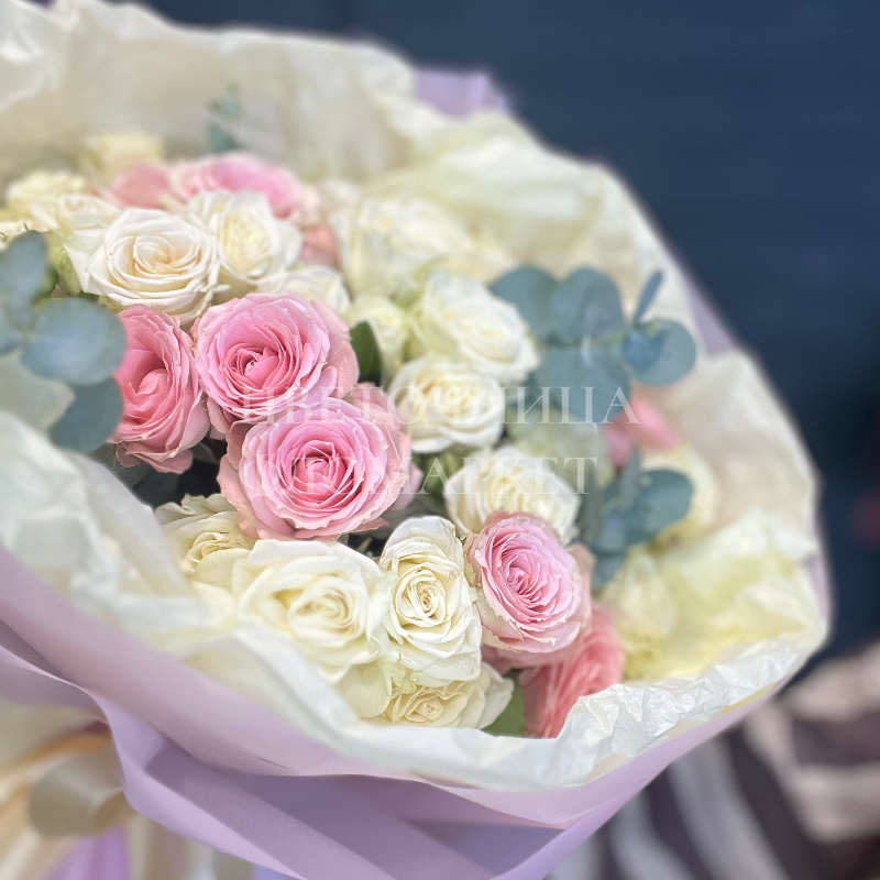 Букет представляет собой элегантную композицию из белых и розовых роз, дополненную нежной зеленью эвкалипта. Нежные оттенки цветов создают атмосферу лёгкости и изящества, делая букет идеальным выбором для любого торжества. Розы аккуратно упакованы в мягкую светло-розовую бумагу с атласной лентой, что придаёт букету завершённый и праздничный вид.