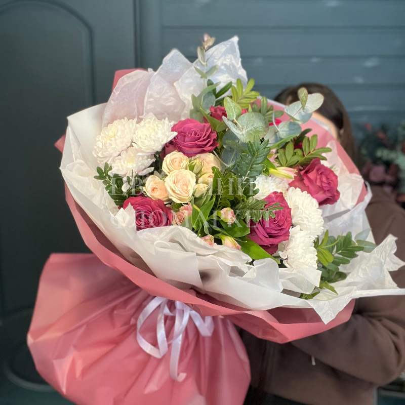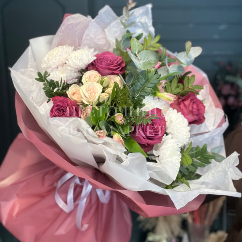 Букет из роз и гвоздик, элегантно упакованный в розовую бумагу с белыми акцентами. Нежные оттенки белых и кремовых цветов в сочетании с яркими малиновыми розами создают романтичный и трогательный образ. Этот букет станет прекрасным подарком для любимой или близкой женщины.