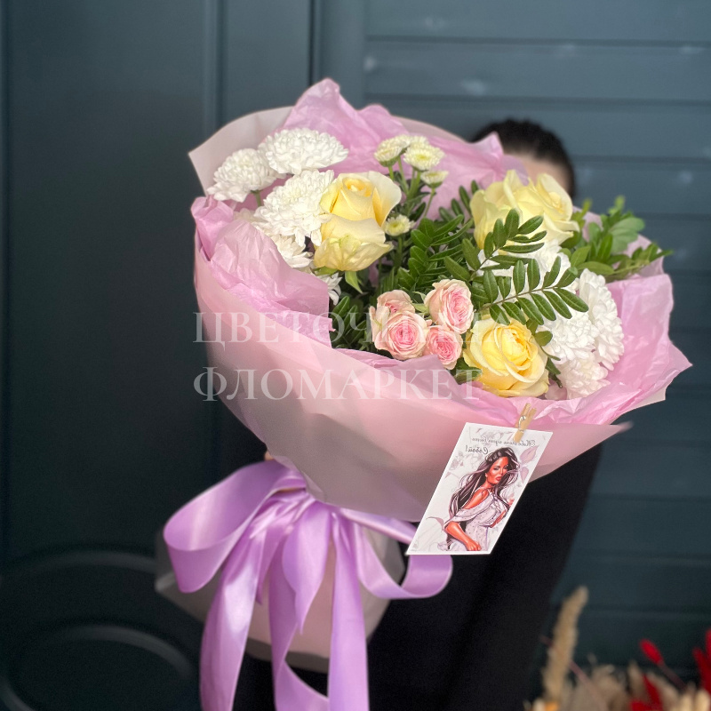 Нежный букет с розовыми и белыми оттенками, перевязанный атласной лентой, который станет прекрасным подарком для близкого человека. В композиции букета гармонично сочетаются розы и гвоздики, что придает ему элегантность и изысканность. Этот букет обязательно принесет радость и улыбку на лицо вашего адресата.