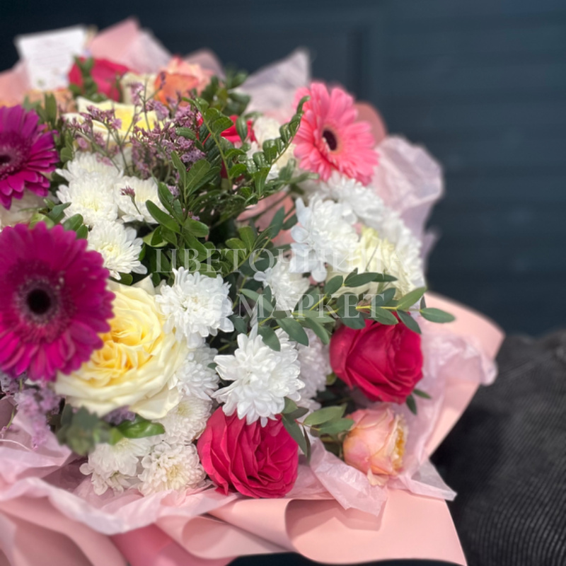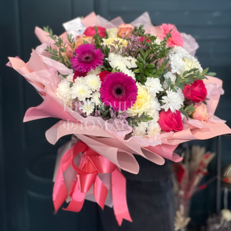 Нежный букет, состоящий из розовых и белых цветов, элегантно упакован в светло-розовую бумагу и украшен атласной лентой. Сочетание ярких и пастельных оттенков создает праздничное настроение, а воздушная упаковка добавляет образу легкость и изящество. Этот букет станет прекрасным подарком для любого торжества.