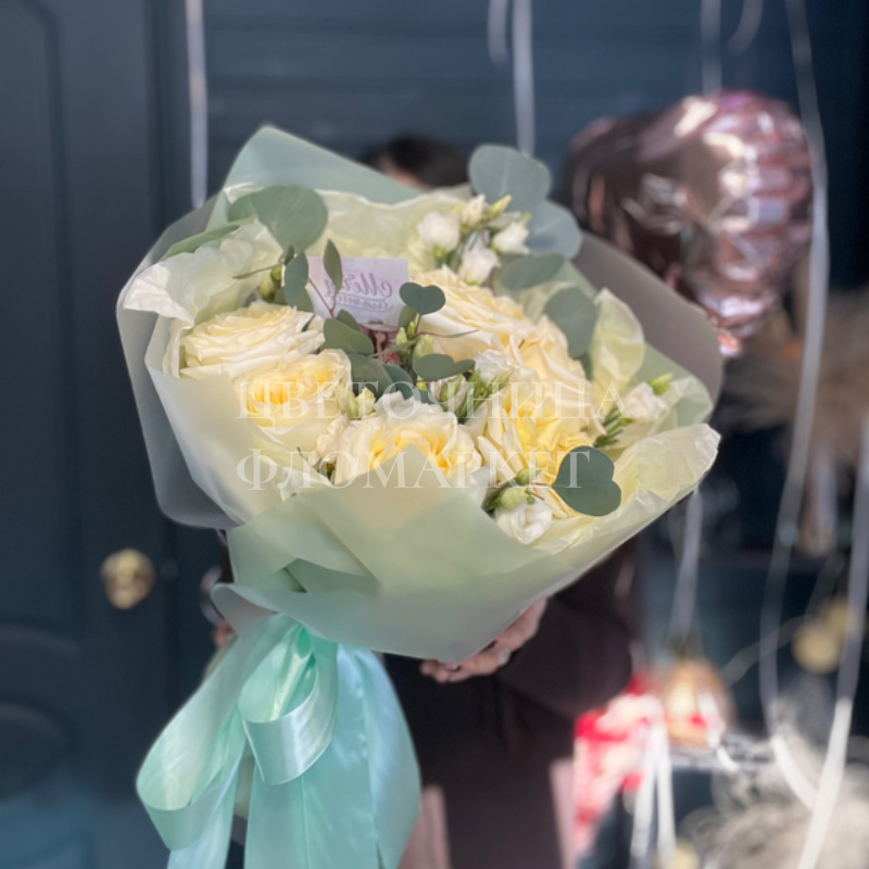 Букет, представленный на изображении, - это нежный и элегантный сбор белых роз, дополненный зеленью эвкалипта. Композиция завернута в светлую упаковку и украшена большим бантом мягкого светло-зеленого оттенка, что добавляет ей романтичности и изысканности. Этот букет идеально подходит для выражения нежных чувств и станет прекрасным подарком.