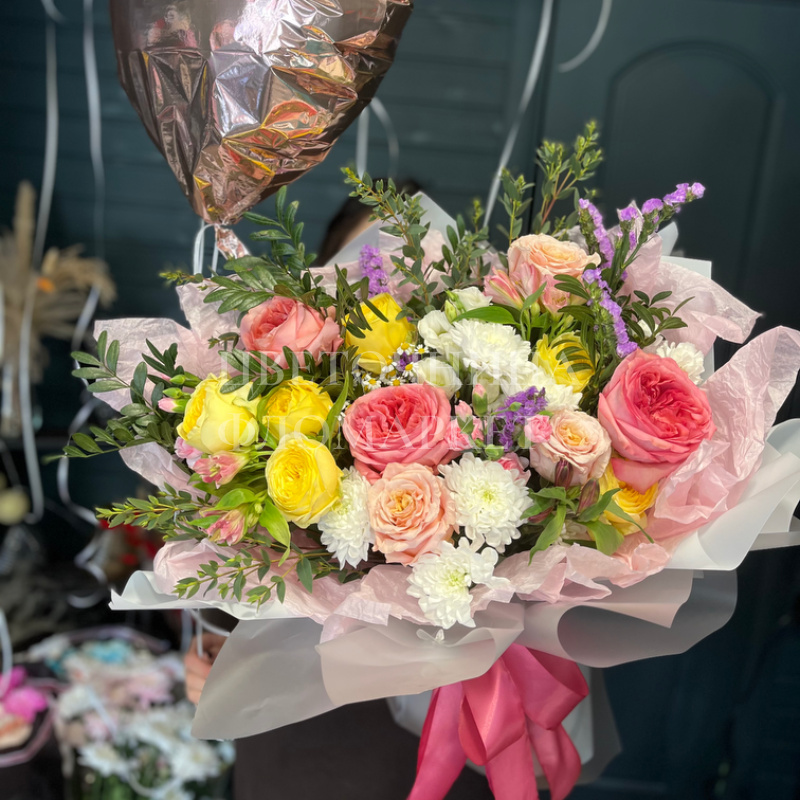 Букет из роз, гвоздик и других цветов в пастельных тонах, элегантно оформленный в белую бумагу с атласной лентой. Нежные оттенки цветов и воздушная упаковка придают букету воздушность и романтичность, делая его прекрасным подарком. Дополненный фольгированным шариком, букет станет ярким и запоминающимся жестом внимания.