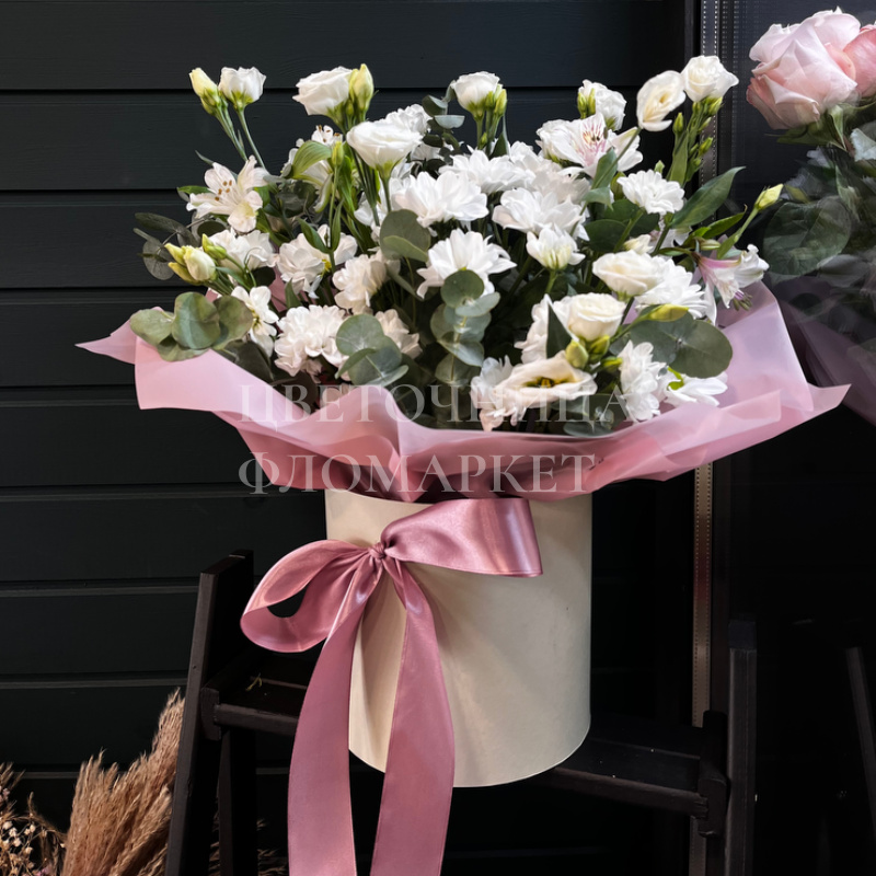 Огромная, шикарная, шляпная коробка с кустовыми розами, лилиями и альстромерией