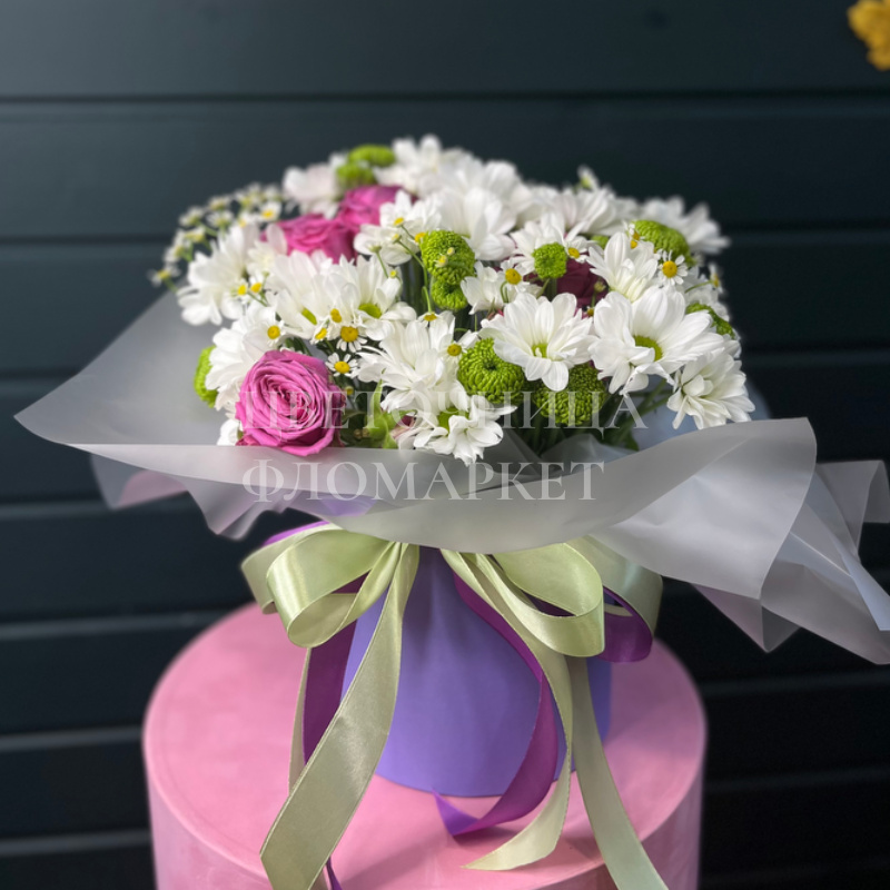 Коробка из хризантем и кустовой розы