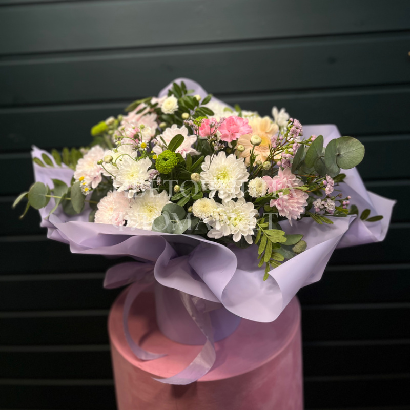 Букет из белых и розовых хризантем, дополненный нежными оттенками гвоздик и изумрудной зеленью эвкалипта, создает впечатление воздушности и легкости. Упаковка из светло-фиолетовой бумаги придает композиции элегантный вид, а цилиндрическая коробка из розового бархата добавляет роскоши. Этот букет идеально подойдет для выражения нежных чувств и создания праздничной атмосферы.