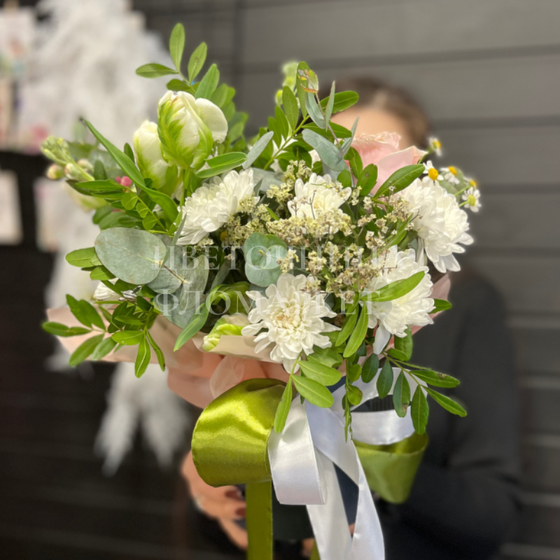 Букет «Свежесть и элегантность» Нежный букет, состоящий из белых хризантем, льна и эвкалипта, дополненный воздушной гипсофилой. Завершает композицию изящная лента оливкового цвета, придавая букету стильный и завершённый вид. Этот букет идеально подходит для любого торжества, наполняя его свежестью и элегантностью. " " , , . - , . , .