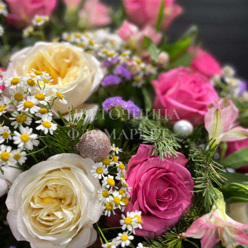 Букет представляет собой великолепную композицию из розовых и белых роз, дополненную ромашками, лилиями и другими декоративными элементами. Нежные оттенки цветов в сочетании с зеленью создают праздничное и элегантное настроение, делая букет идеальным выбором для любого торжества. Украшенный атласной лентой, этот букет станет прекрасным подарком.