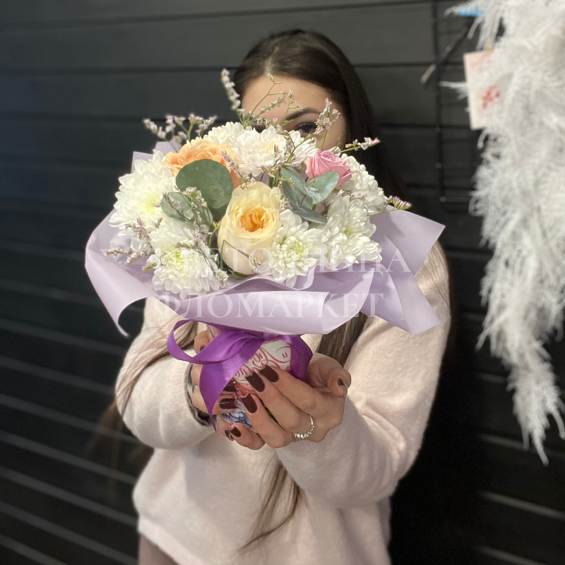 Краткое описание букета: Нежный букет в пастельных тонах, состоящий из роз, хризантем и гипсофилы, элегантно дополненный зеленью эвкалипта. Легкая и воздушная композиция, которая станет прекрасным подарком для самых близких. Сочетание мягких оттенков создает атмосферу тепла и заботы.