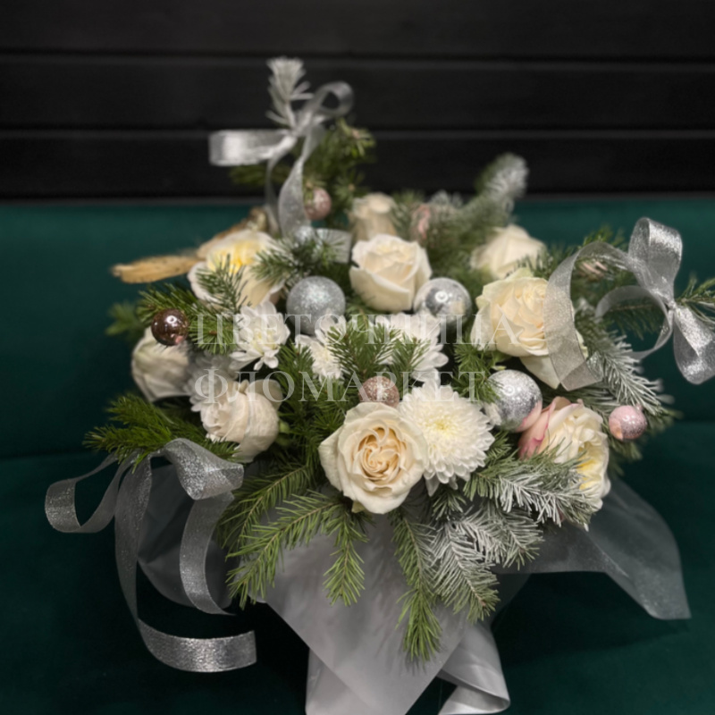 Зимний букет в элегантных белых оттенках, дополненный веточками ели и блестящими украшениями, создаёт праздничное и уютное настроение. Серебристые ленты и шары придают композиции особую изысканность и новогоднюю атмосферу. Букет идеально подходит для создания волшебства в преддверии праздников.