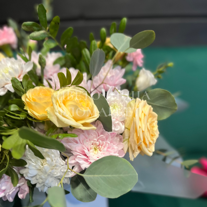 Нежный букет в мягких тонах, состоящий из роз, гвоздик и других цветов, идеально подойдёт для выражения тёплых чувств и создания уютной атмосферы. Композиция в белом керамическом вазоне добавляет элегантности и завершённости. Букет станет прекрасным подарком на любой повод.