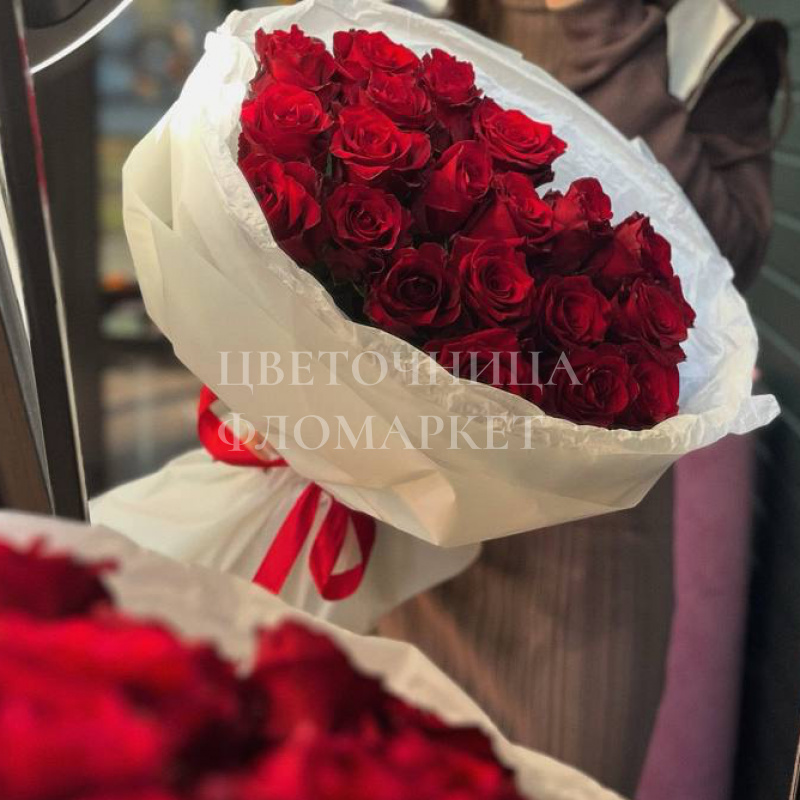 Букет из 21 роскошных темно-красных роз, элегантно упакованный в белую бумагу с красным бантом. Этот классический подарок символизирует любовь и страсть, идеально подходя для особых моментов.