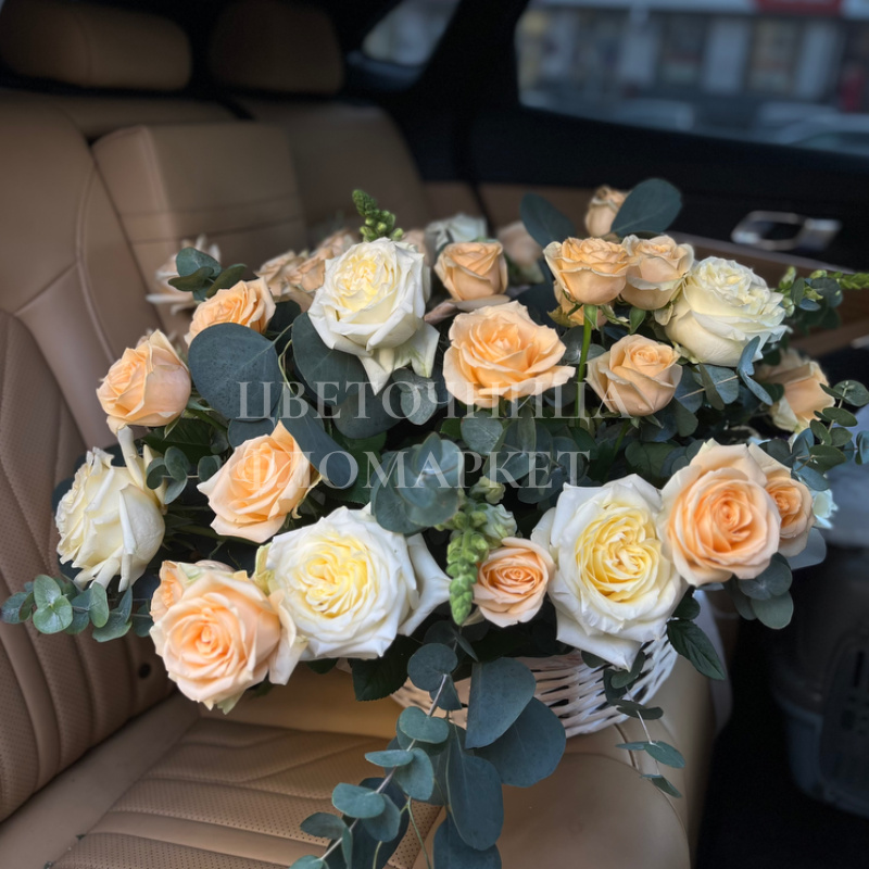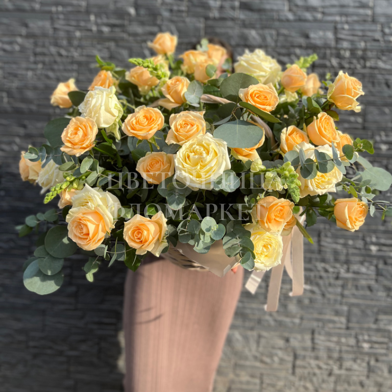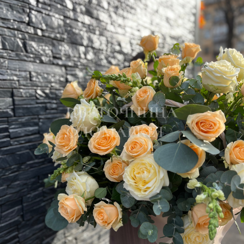 Букет представлен в медовых и персиковых тонах с добавлением элегантной зелени эвкалипта. Нежные оттенки роз создают романтичную и спокойную композицию, идеально подходящую для выражения тёплых чувств. Букет прекрасно передаёт гармонию и лёгкую свежесть, наполняя пространство уютом и красотой.